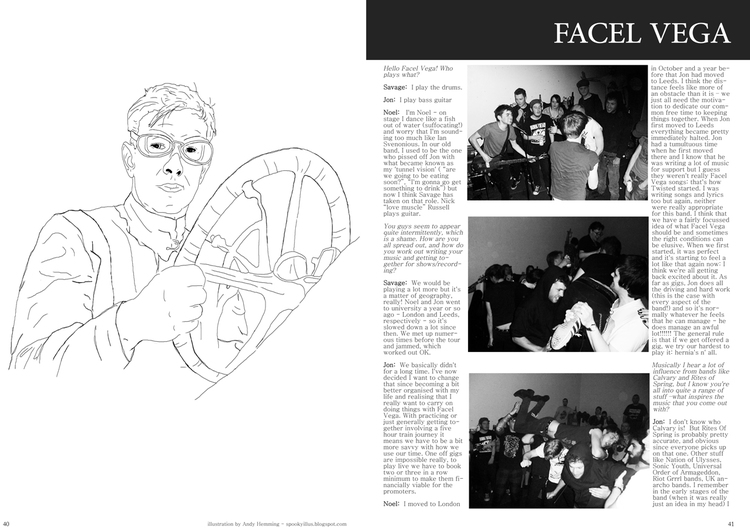 Spread from 'Lost Tapes From the Federal Sessions', a zine reviewing the DIY punk scene in 2010. Interviews with and pictures of bands from all over the UK as well as some from abroad. I designed the zine itself and submitted illustrations for some of the pages. The illustration on this spread is one of mine.